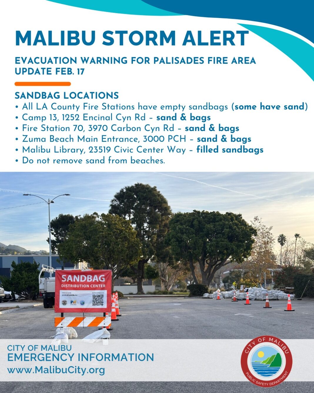 Free sandbags are limited to 10 per resident or business while supplies last. They are available for pick-up by appointment at West Hollywood’s Operations Center, located at 7317 Romaine Street. Residents and business owners may call (323) 848-6591 or send an email to phertz@weho.org to schedule an appointment to pick up sandbags on Tuesday, February 17; Wednesday, February 18; and Thursday, February 19 from 7 a.m. to 4 p.m. each day. Sandbags are available only while supplies last.
